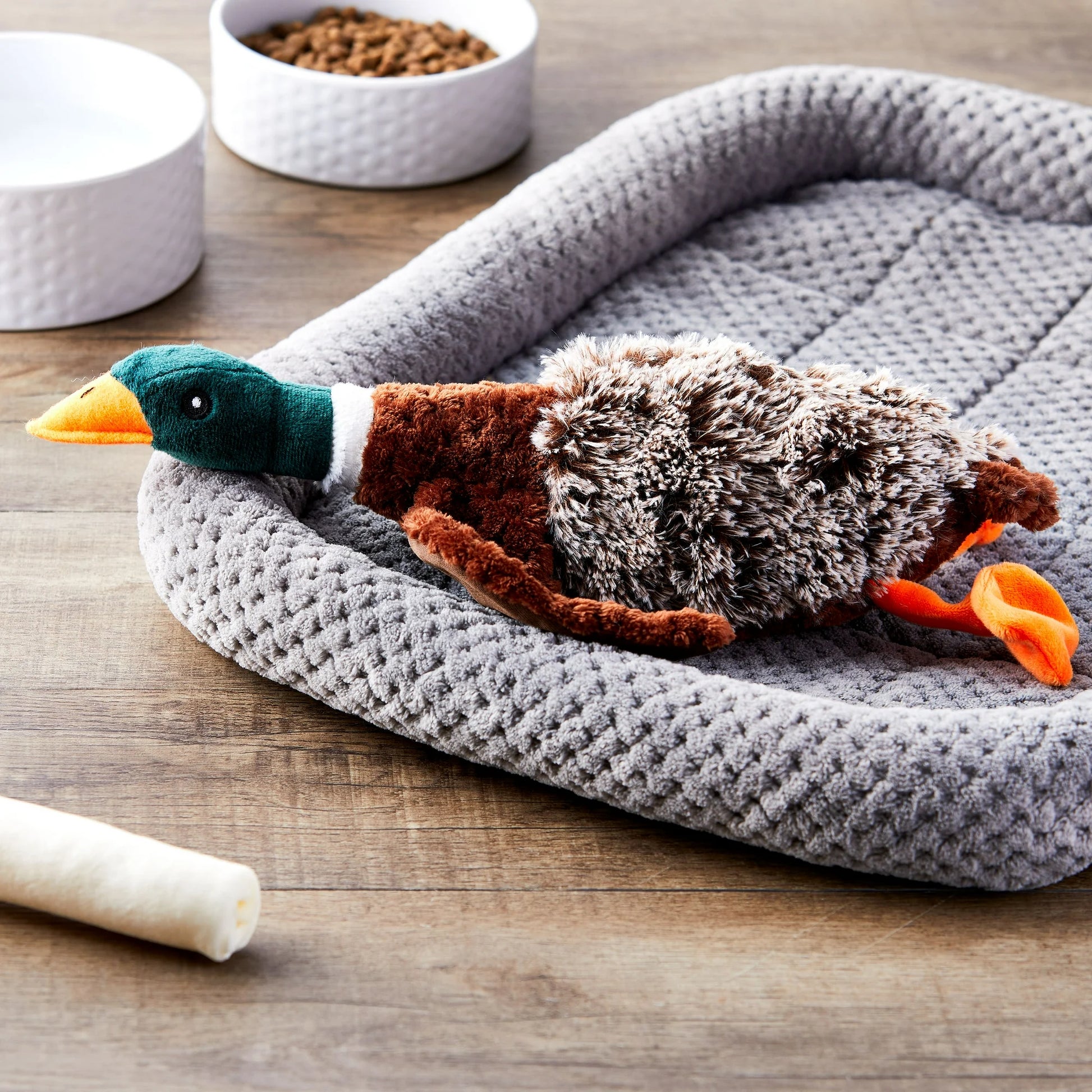 Vibrant Life Plush Duck Dog Toy är en bedårande gräsandsleksak i form av en söt anka. Det mjuka plyschtyget har olika färger och texturer. Leksaken har orange näbb och fötter samt ett grönt ansikte. Kroppen är brun och grå med hängande, ostoppade vingar. Insidan är stoppad och innehåller en pipljudskälla som ger ifrån sig ett tutande ljud när man klämmer på den.