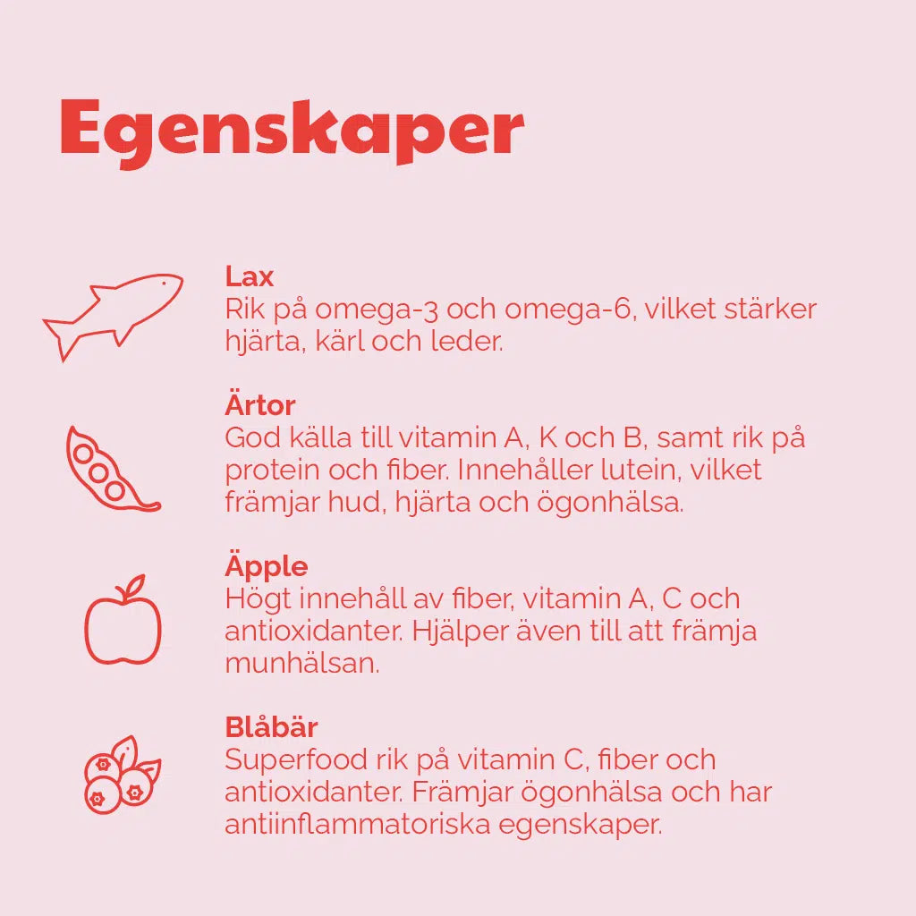 Ett knaprigt och smakrikt hundgodis gjort på färsk lax och blåbär, rikt på omega-fetter, protein och antioxidanter. Ingredienserna är 100% naturliga och fria från tillsatser och spannmål. Passar både till vardags och träning.