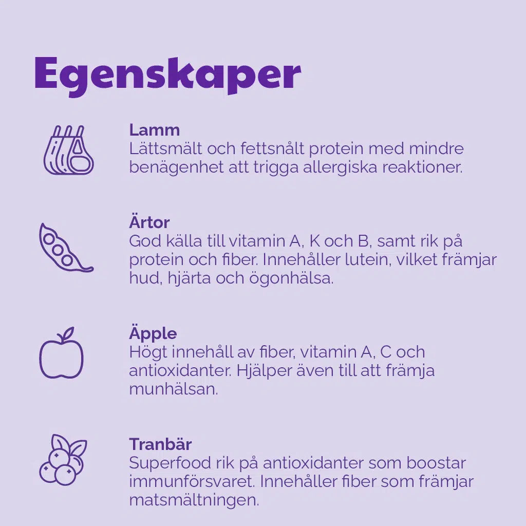 Lamm 35%, ärtor, hydrolyserat lammprotein 15%, kycklingfett (konserverad med tokoferol), torkat äpple, torkade tranbär 4%, linfrön och bryggerijäst.