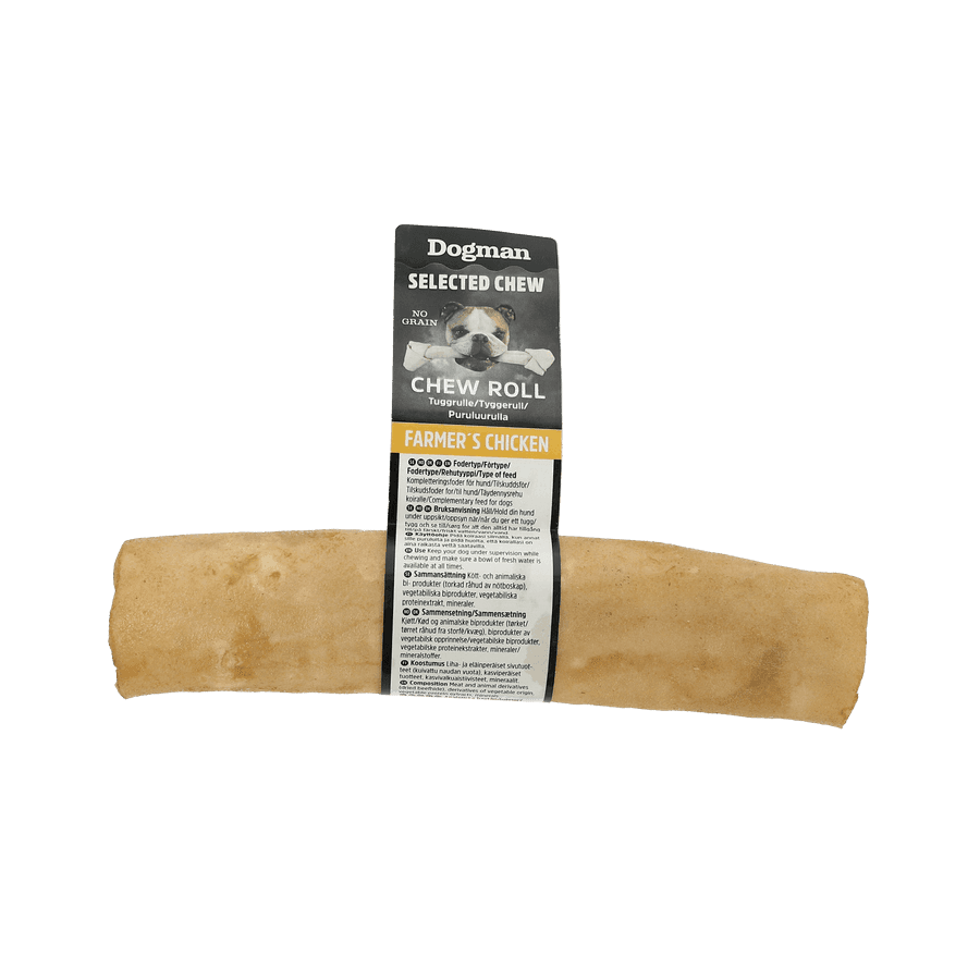 Naturlig premiumtuggrulle av extra tjock råhud av hög kvalitet med utsökt smak av kyckling. Förlänger tuggtiden, tillgodoser tuggbehovet och bidrar till en sund tandhälsa. Håll alltid hunden under uppsikt när den tuggar på tuggben.