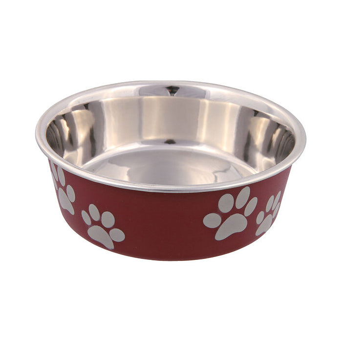 Denna matskål är både stilren och funktionell. Den är tillverkad av rostfritt stål vilket gör den hållbar och enkel att rengöra. Matskålen finns i två färgalternativ, antingen röd eller svart, och är prydd med vita tassavtryck.