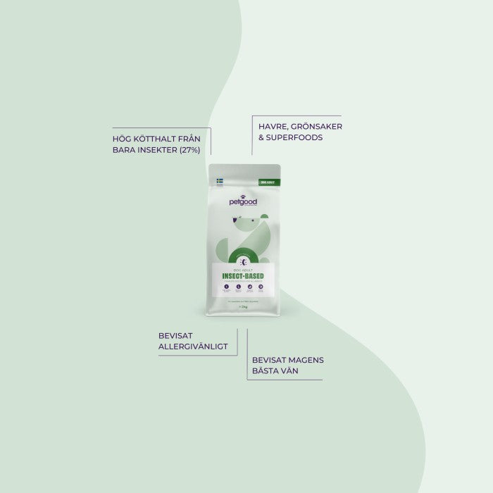 SAMMANSÄTTNING: Larver av svart soldatfluga (Hermetia illucens) (27%), havre, majs, ärtor, torkad potatis, olivolja, bryggerijäst, mineraler (kalciumkarbonat, dikalciumfosfat, natriumklorid), torkat sjögräs, torkad tomat, linfröolja, inulin (källa till fruktooligosackarider (FOS)) (0.2%), torkad rödbeta, torkad morot, torkad grönkål, torkad persilja, yucca schidigera (500 mg/kg).