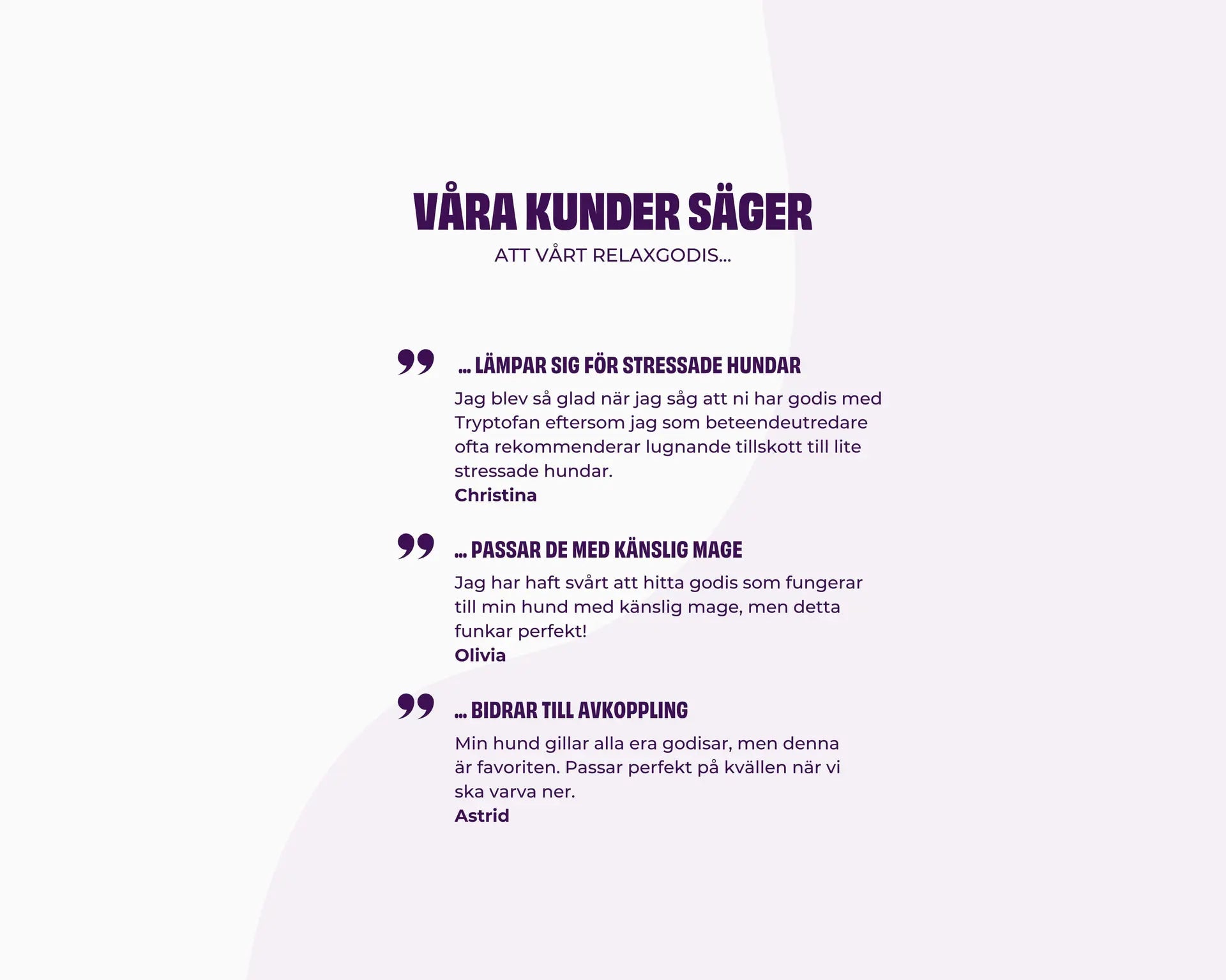 Vårt näringsrika relax-godis innehåller B-vitamin, tryptofan, passionsblomma och magnesium, näringsämnen som kan ge en avslappnande effekt och stötta återhämtning av muskler och hjärna. De semi-mjuka godisarna är också larvigt goda! En påse innehåller 100g och kan ges till både vuxen hund och valp från 6 månader.