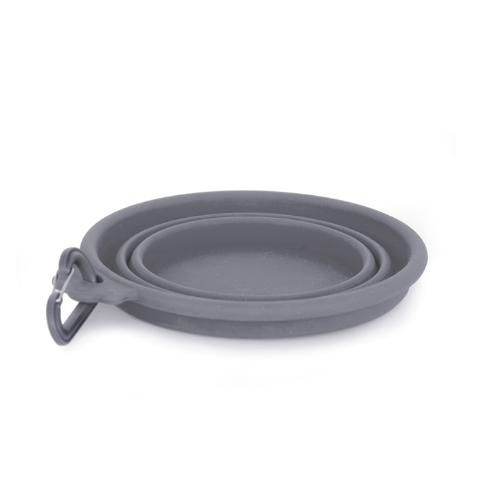 Hopfällbar skål av extra mjuk och följsam silikon. Perfekt att ta med på resan. Du fäster den enkelt på t.ex. kopplet eller byxorna med hjälp av den medföljande karbinhaken.