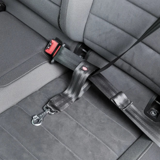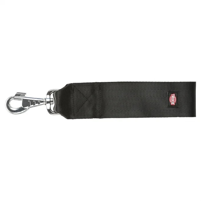 Enligt lagstiftningen är det krav på att hunden ska vara säkrad vid en inbromsning, antingen med hjälp av en bur eller en sele tex. Trixies kraftiga fästanordning är en länk mellan selen och bilbältet och passar i de allra flesta bilar. Med en smidig pistolhake som är läst att fästa i selen.