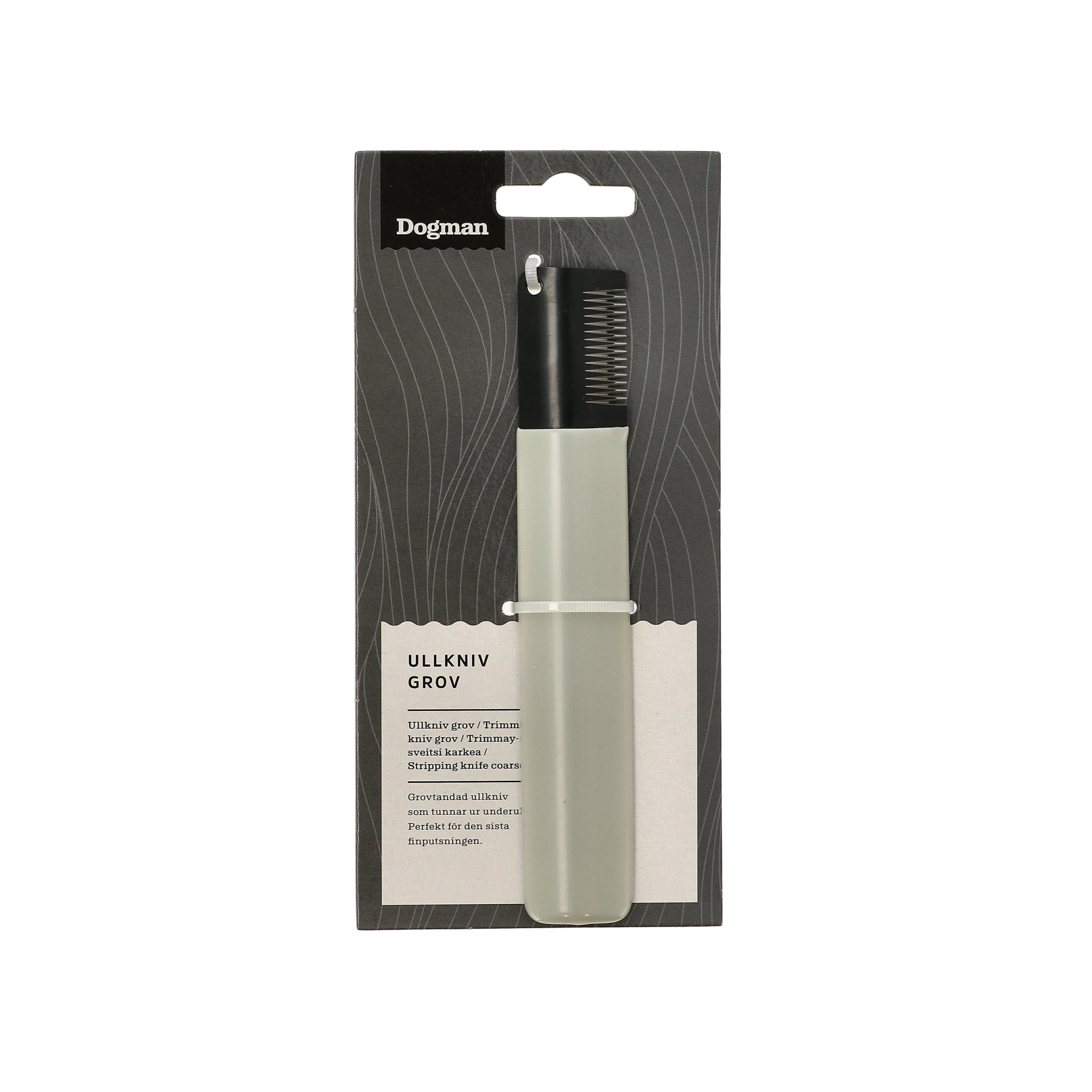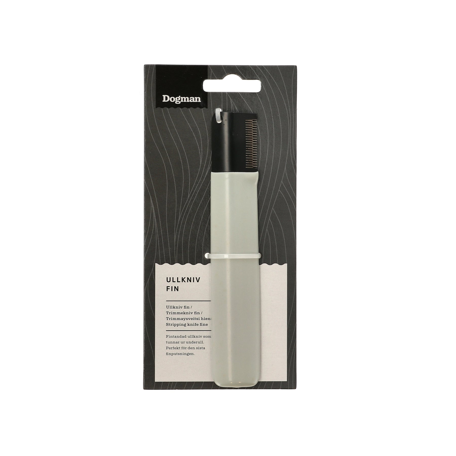 Ullkniv som tunnar ur underull. Perfekt för den sista finputsningen. Dra ullkniven försiktigt med lätt hand i pälsens riktning, den ska inte skära av topphåren utan endast ta med sig underullen.